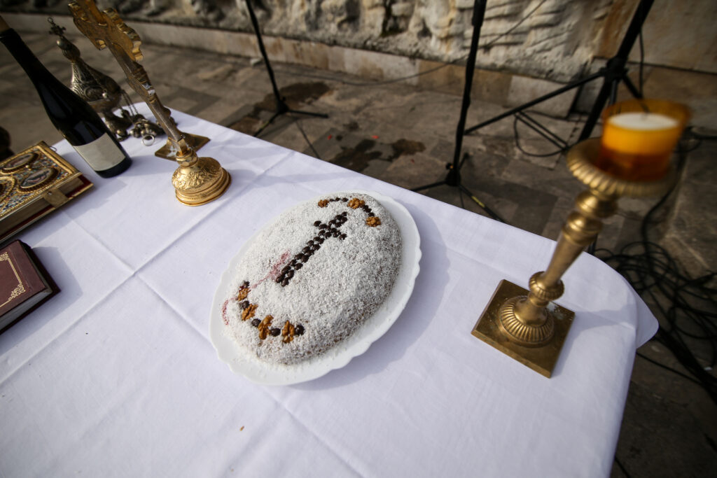 The ritual concludes within the church nave during the memorial service. The tray is blessed by the priest, and the congregation partakes in the food. As the faithful consume the kolyva, reciting “May their memory be eternal,” the act serves as a physical communion between the living and the dead, reaffirming the belief that life, like the wheat, continues after burial.