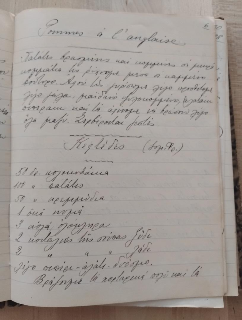 Grandmother Paraskevi was a great cook and her daughters wrote down her recipes for her family to use, I am including here a page from their notes – which as you can see were not detailed – more of a guide – because herbs and flavourings are not exact, they depend on how each cook feels having tasted them.